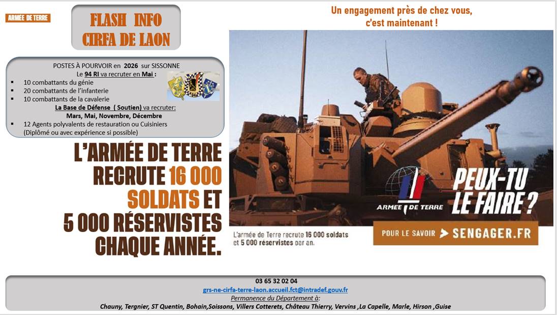 Pour 2026, le Pôle SOUTIEN de SISSONNE avec le 94e Régiment d’Infanterie (site JDC), vont recruter et former des futurs soldats .