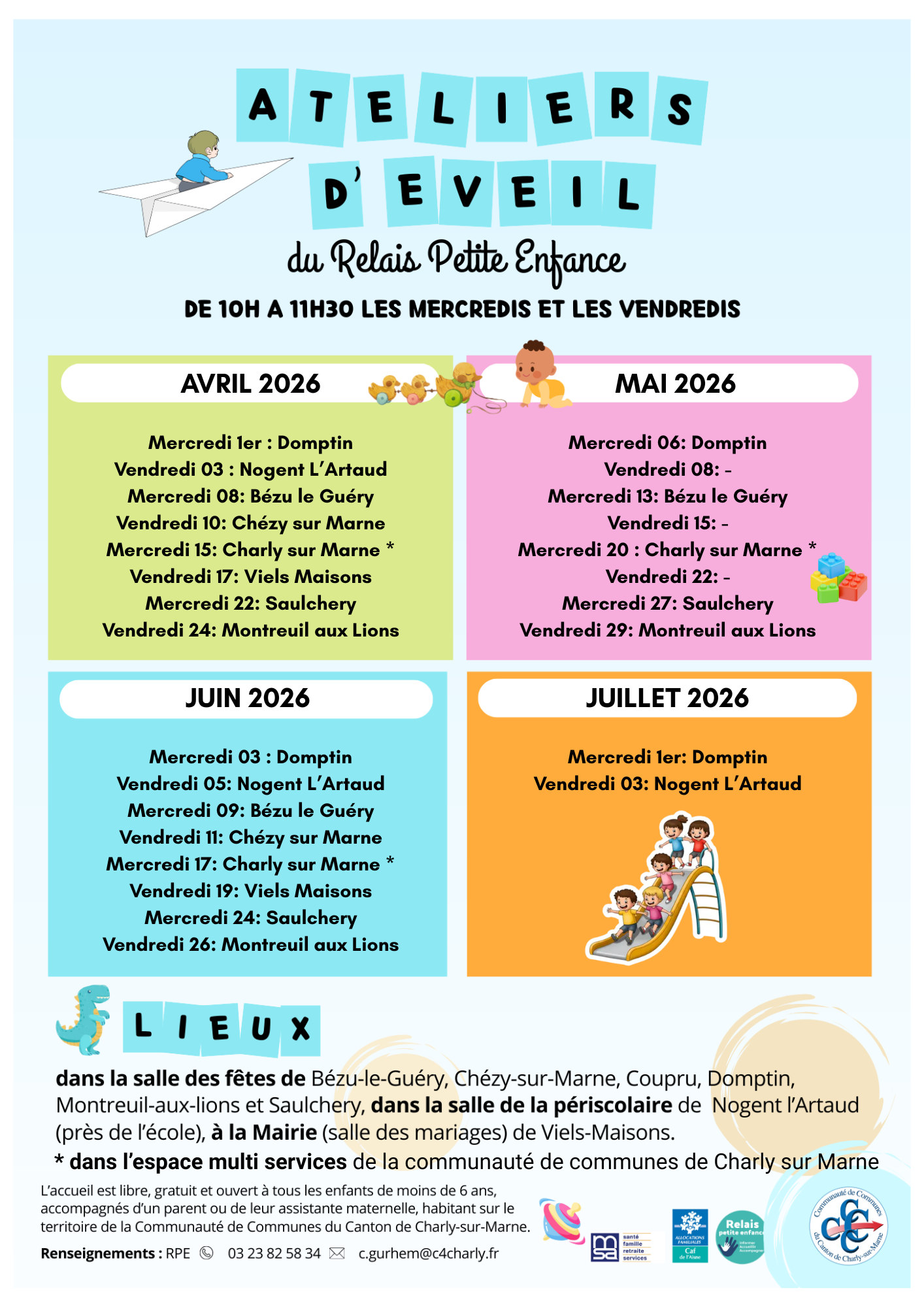 Pour plus d’informations, n’hésitez pas à consulter la page dédiée au Relais Petite Enfance :https://www.c4-charlysurmarne.fr/-R...->Ces ateliers sont gratuits et sans inscription.
